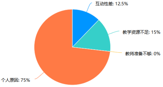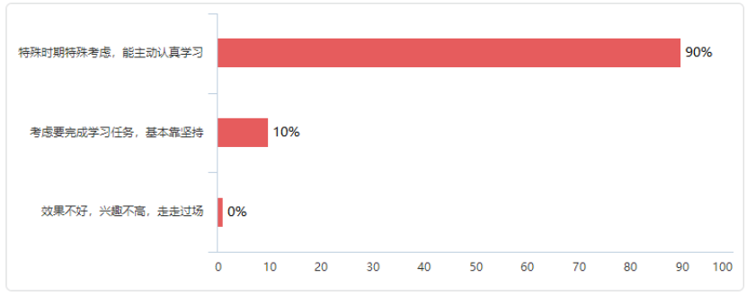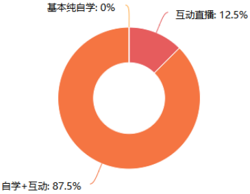 为改进教学方式,增强在线教学效果,提高研究生教学质量,通过对在线课程的调查问卷发现,以互动为主自学为辅的教学方式占比87.5%,全直播的教学方式占比12.5%,研究生单次课集中听课时间约80分钟。各课程教学平台建设基本完善,教师能严格按照教学计划开展网络教学,研究生学习态度端正,整体教学效果较好。