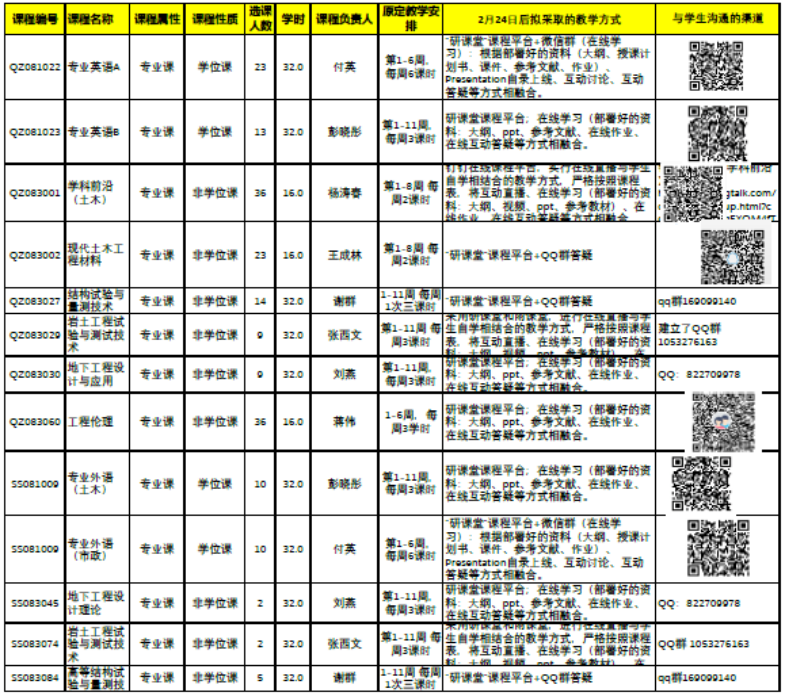 根据学校关于研究生教学的通知要求,学院出台有关教学计划与教学督导相关文件(《土木建筑学院2019-2020学年第二学期研究生教学督导工作安排》、《土木建筑学院2019-2020学年第二学期研究生教学工作安排》),就学院研究生课程的具体安排、教学资源、教学方式、跟踪督导等相关内容做了部署,并会同研究生院对各课程教学资源及平台准备情况进行检查,将每门课程详细的教学平台、师生交流群、教学资源等提前通知研究生,预先演练,保证教学工作的顺利开展。