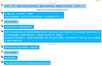 在教学过程中,我院各任课教师充分利用研课堂、QQ课堂、钉钉、雨课堂等在线教学平台,通过直播、互动等方式开展多种不同形式的线上教学工作,并做好课程教学的跟踪交流。目前,学院已开设全日制学硕、专硕及非全日制研究生专业课程24门,参与专业在线上课教师10人,研究生学习累积400余人次,全部按照预定教学计划顺利完成各项教学任务。