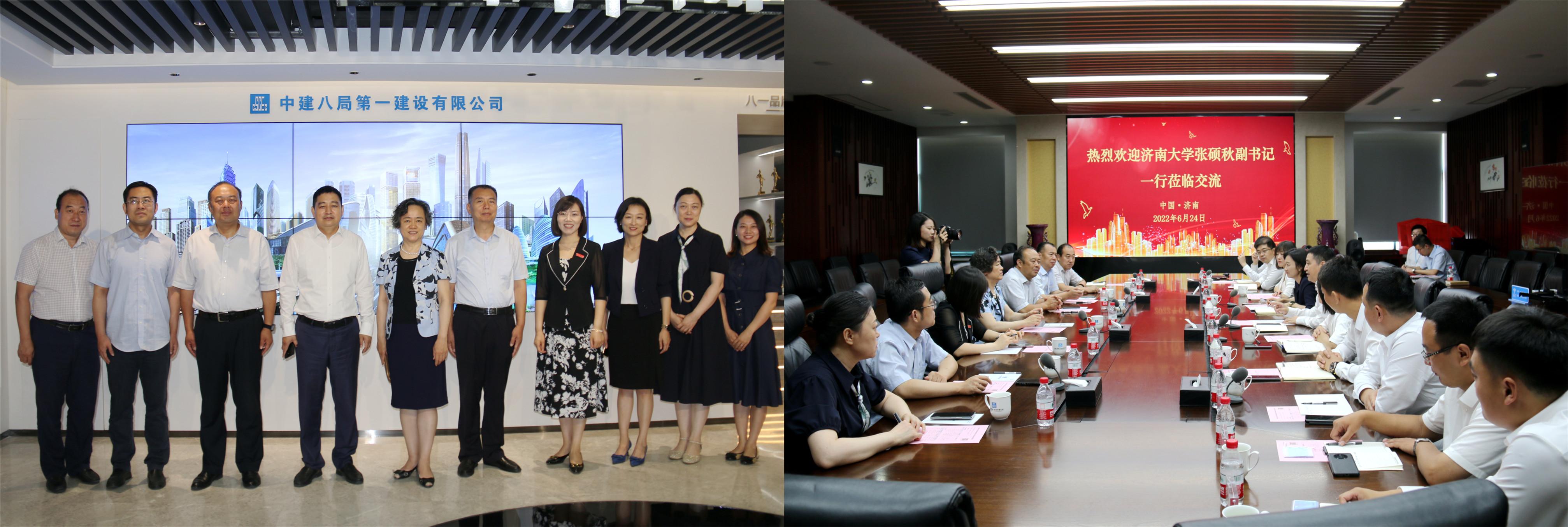 为进一步巩固拓展校企合作渠道,深入挖掘就业资源,助力毕业生高质量就业,6月24日上午,济南大学—中建八局第一建设有限公司(以下简称“中建八局一公司”)校企合作洽谈会在中建八局一公司总部召开。济南大学党委副书记张硕秋,党委学生工作部(处)部(处)长刘芝,济南大学审计处处长栾志强,土木建筑学院党委书记刘效东,土木建筑学院院长谢群,济南大学学生工作部(处)副部(处)长董俊杰,土木建筑学院党委副书记、副院长朱小燕,土木建筑学院学办主任白雪飞参加了洽谈会。中建八局一公司党委副书记、总经理牛化宪,中建八局一公司党委副书记、工会主席聂丽,中建八局一公司人力资源总监马珊珊,党委工作部(企业文化部)部长齐昕新 ,以及济南公司执行总经理谢新坡等部分校友代表出席了会议。