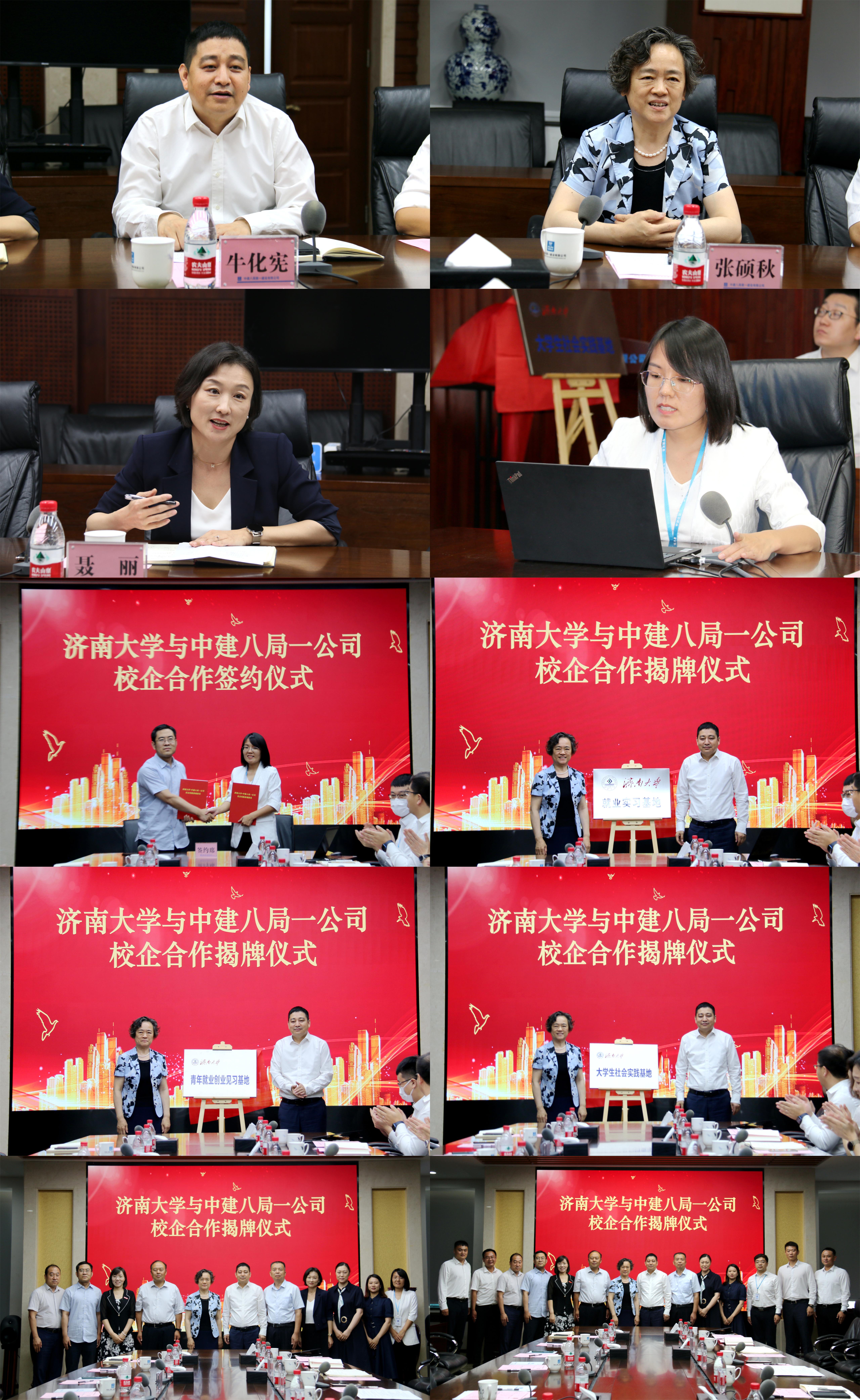 土木建筑学院院长谢群代表校方与中建八局一公司签订了校企合作协议书,张硕秋与牛化宪总经理共同为济南大学毕业生就业实习基地、大学生社会实践基地、青年就业创业见习基地揭牌。
