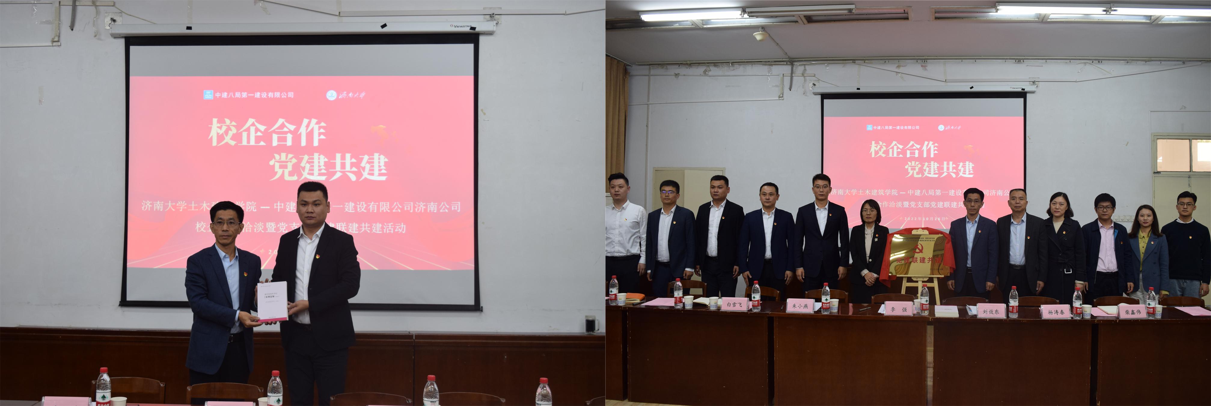 10月26日,我院与中建八局第一建设有限公司济南公司在第八教学楼举行校企合作洽谈会暨党支部党建联建共建活动。学校党委常委、副校长李强出席活动、学院党委书记刘效东、院长谢群、副院长杨涛春以及学院市政系师生联合党支部和研究生党支部党员代表和中建八局一公司人力资源总监马姗姗,中建八局一公司济南公司执行总经理、党委副书记、工会主席、土木建筑学院 2009 届校友谢新坡,中建八局一公司济南公司副总经理土木建筑学院 2012 届校友肖劲松,中建八局一公司济南公司人力资源部经理初新阳,中建八局一公司文庄租赁住房项目党支部书记、项目经理辛建鑫,中建八局一公司济南公司党群工作部副部长、综合办公室副主任张藤栊及中建八局一公司文庄租赁住房项目党支部党员共同参加活动。活动由学院党委副书记、副院长朱小燕主持。