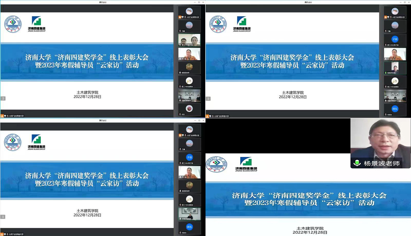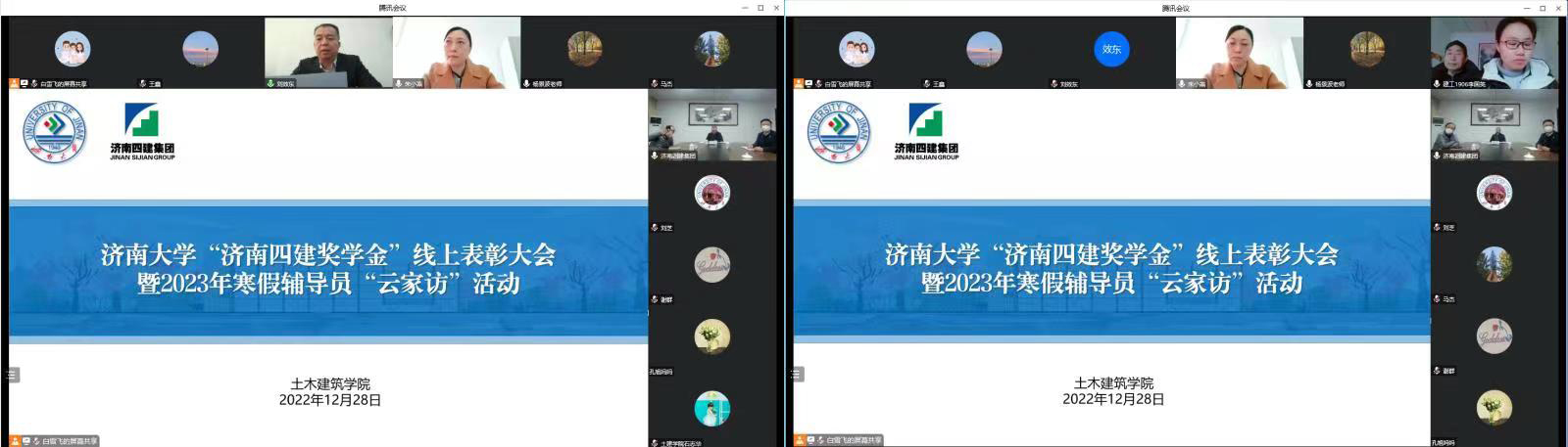 12月28日,土木建筑学院举行济南大学“济南四建奖学金”线上表彰大会暨2023年寒假辅导员“云家访”活动。济南四建(集团)有限责任公司董事长、党委书记李力,党委委员、纪委书记兰利孝,技术质量部部长赵得铭,人力资源部部长经琦,人力资源部副部长杨电辉参加了活动;济南大学党委副书记杨景波,济南大学学生工作部(处)部(处)长 刘芝,土木建筑学院党委书记刘效东,院长谢群,济南大学学生工作部(处)副部(处)长马杰出席了活动;土木建筑学院全体辅导员老师及获得2022年度“济南四建奖学金”的学生及家长参加了活动。会议由土木建筑学院党委副书记、副院长朱小燕主持。