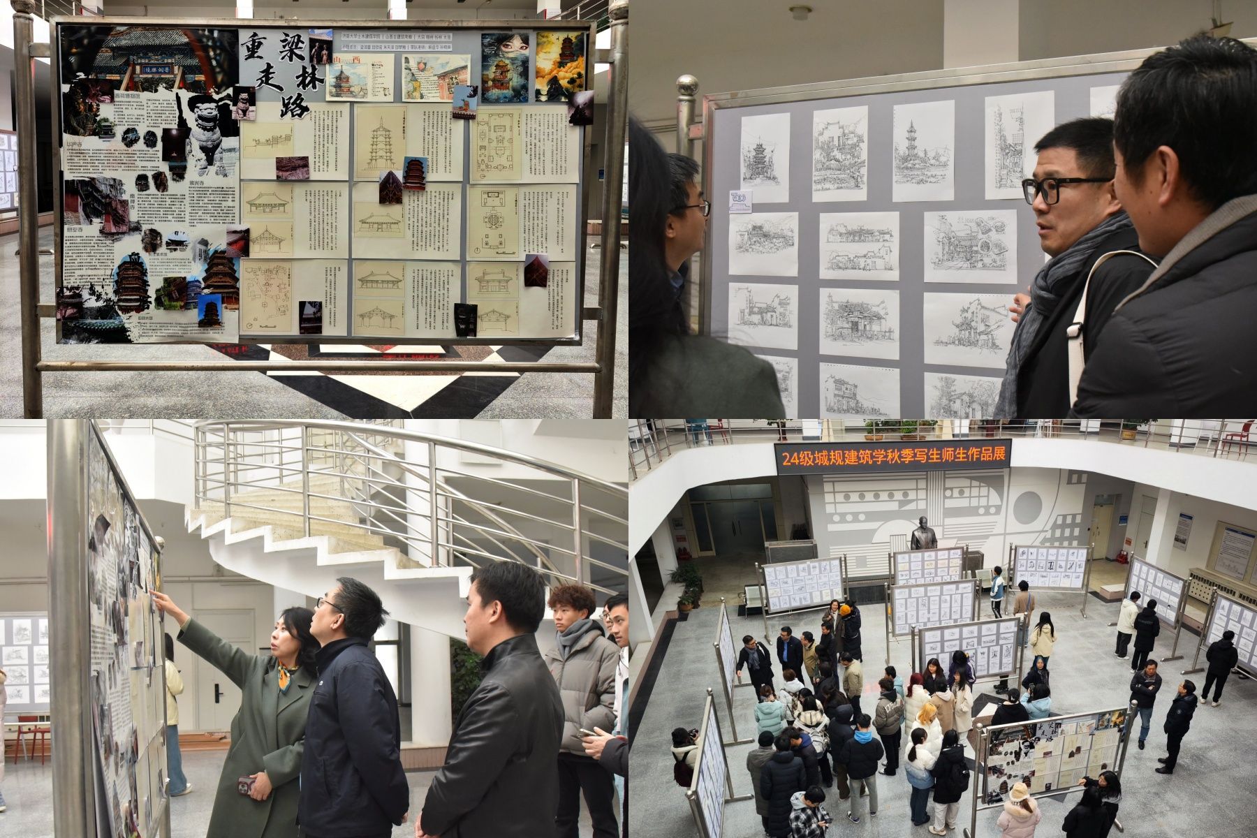 本次作品展展示2024级城规建筑学专业学生指导教师在安徽黟县南屏村和宏村开展美术实习过程中的写生作品。所展示的作品专业特色鲜明,完成质量高,一笔一画之间,浸透着师生对山河美景的热爱,展示着师生对专业创作的热情和追求。本次作品展还同时展览了今年暑期建筑学专业学生在山西开展古建筑调研社会实践的成果。学生用手绘和影像,描绘出佛光寺、应县木塔等古建筑的历史脉络、建筑美学及保护现状。