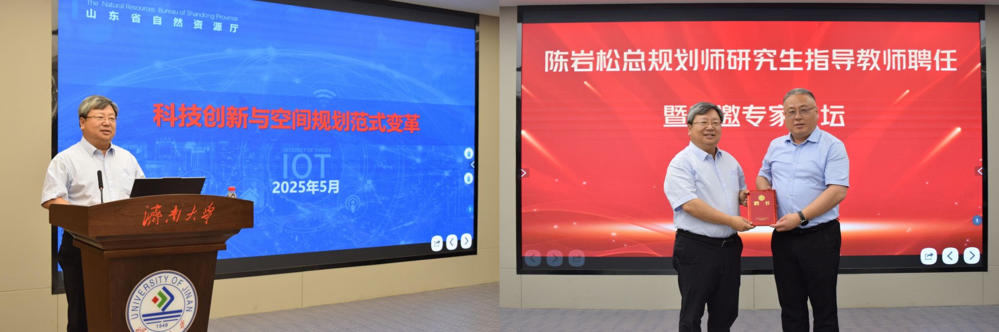 5月22日,我院在第五学术报告厅举行山东省自然资源厅总规划师陈岩松研究生导师聘任仪式暨学术报告会。济南大学党委常委、副校长黄加栋出席活动,合作发展处、土木建筑学院相关负责人及师生代表参加。活动由土木建筑学院院长谢群主持。