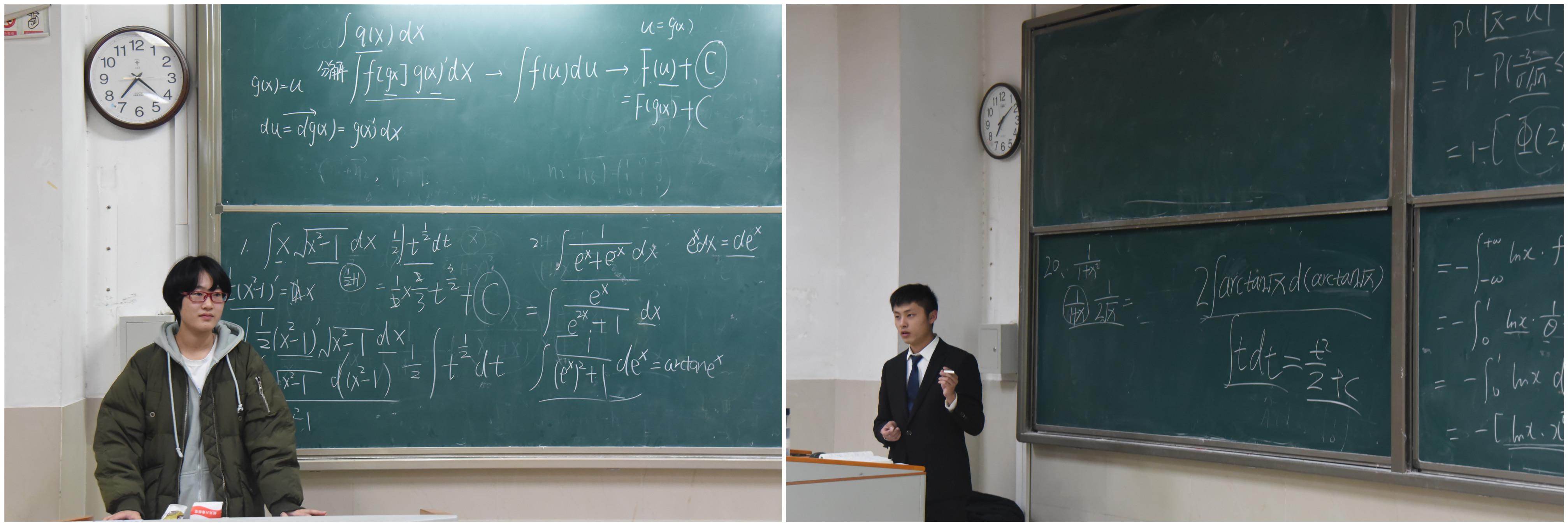 李宇航讲解第一类,第二类换元积分的例题,巩固学生相应章节的知识点,同时,他详细而严谨地解题思路步骤,进一步夯实了同学们的基础知识,以及拓展了同学们的解题思路。周小草通过利用平常解题总结的解题方法解答课本上的难题,强调课本的重要性,同时,举出多个经典例题,用清晰的解题步骤,帮助同学们规范答题步骤,理解基础知识点。课堂上,同学们积极回应,形成了愉快的课堂氛围。