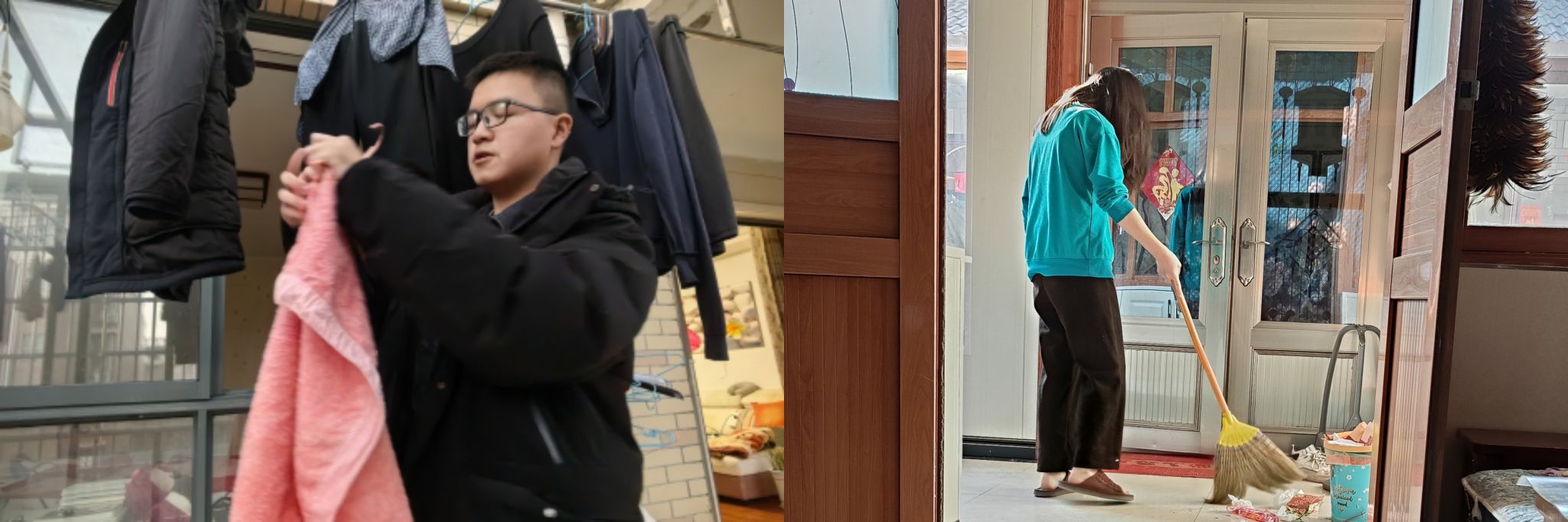 扫除茅舍涤尘嚣,一炷清香迎新年。一些同学利用空闲时间,与家人一起打扫卫生、布置节日氛围,家中焕然一新,迎接新年的到来。