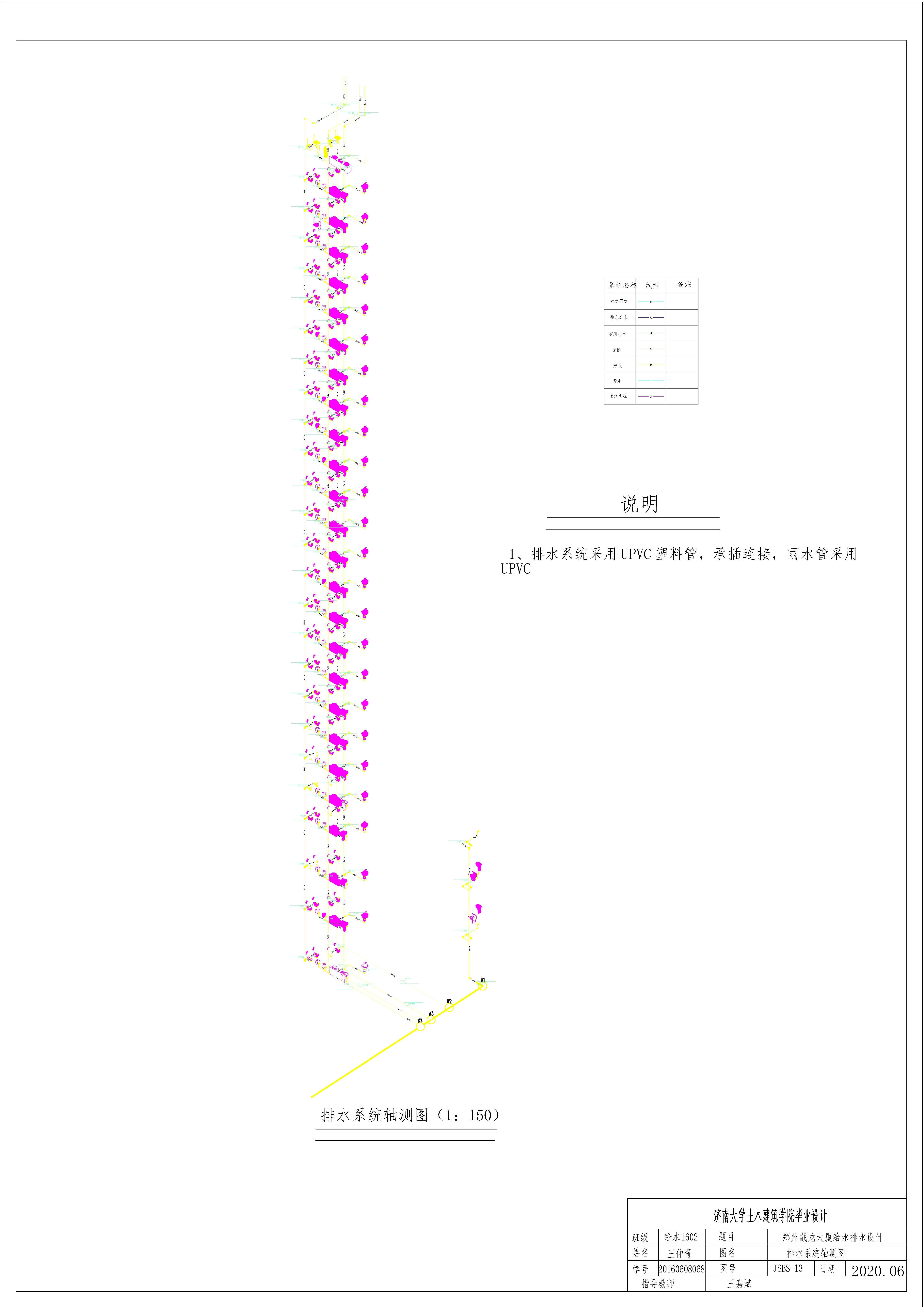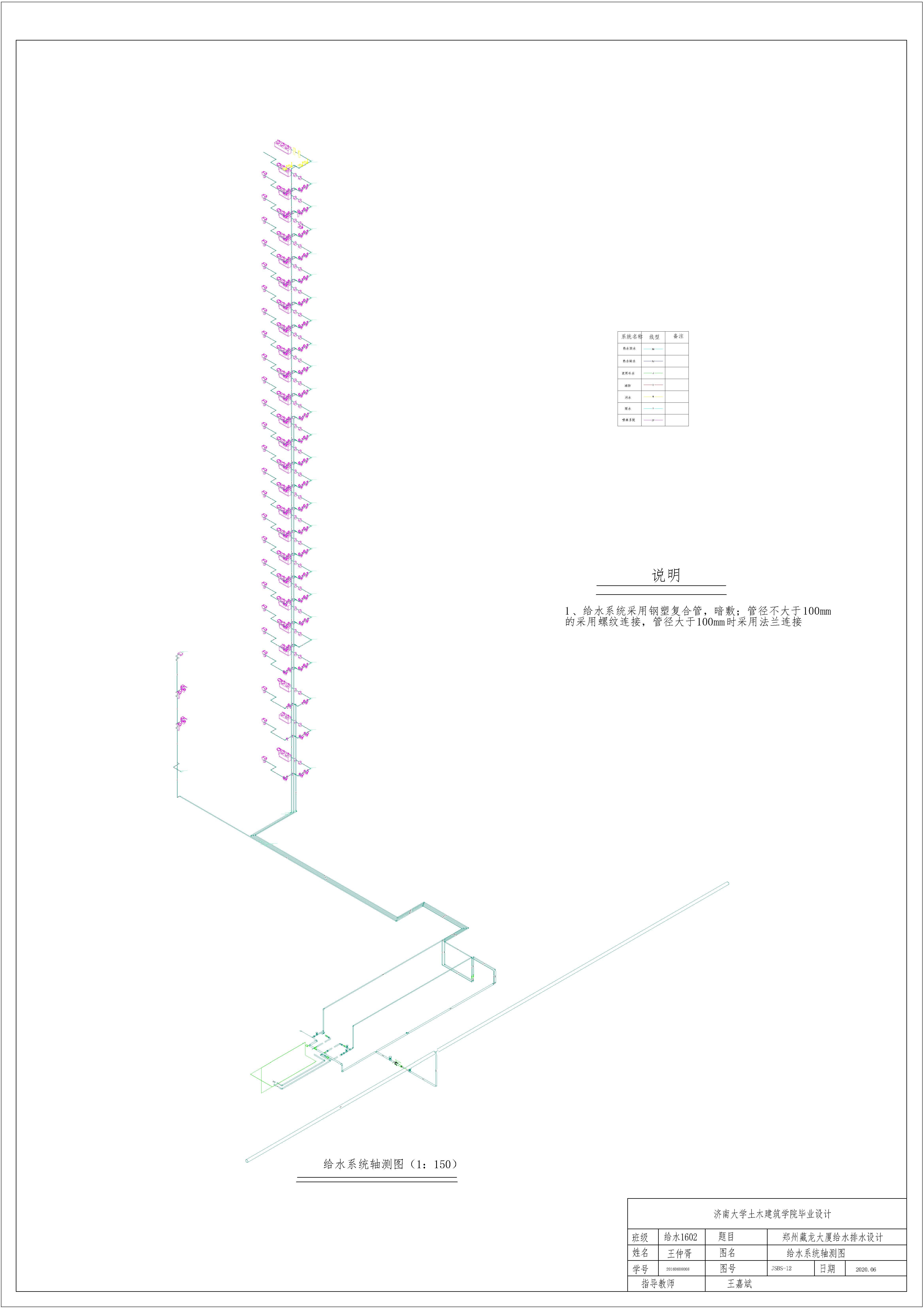 设计简介:本设计运用BIM技术进行毕业设计的全程设计,运用Revit软件进行全部设计。本设计是二十七层的综合性高层建筑的建筑给水排水设计,其中包含:给水系统、排水系统、雨水系统、自动喷淋灭火系统,消防栓系统以及热水包括热水循环系统。给水系统采用竖向分区,分为高、中、低三个区进行供给。一层到三层为低区,由市政管网直接供水;地上四层到地上十五层为中区,由生活泵房内的变频水泵直接提供;十六层到二十六层为高区,由水泵房内变频水泵直接提供。排水系统采用污废水合流排放,地上二层及以上的污废水由重力自流到地下一层排出室外,地上一层单独设置排出。热水系统采用竖向分区供水,分区方式与生活给水系统分区一致,热源系统采用市政蒸汽,同时设置热水循环系统,生活泵房设置在地下一层。雨水排水系统采用单雨水斗排水系统,按照郑州当地的暴雨强度与重现期选取雨水计算参数,进行雨水的设计,流入室外雨水检查井,并排入雨水管网。消防系统用水采用消防水池,消防水池放置在地下二层中。消防水箱设置在屋顶机房层。消火栓系统水平管各层成环,自动喷淋灭火系统由地下二层消防水泵直接供水,与室内消防栓灭火系统共用消防水泵。