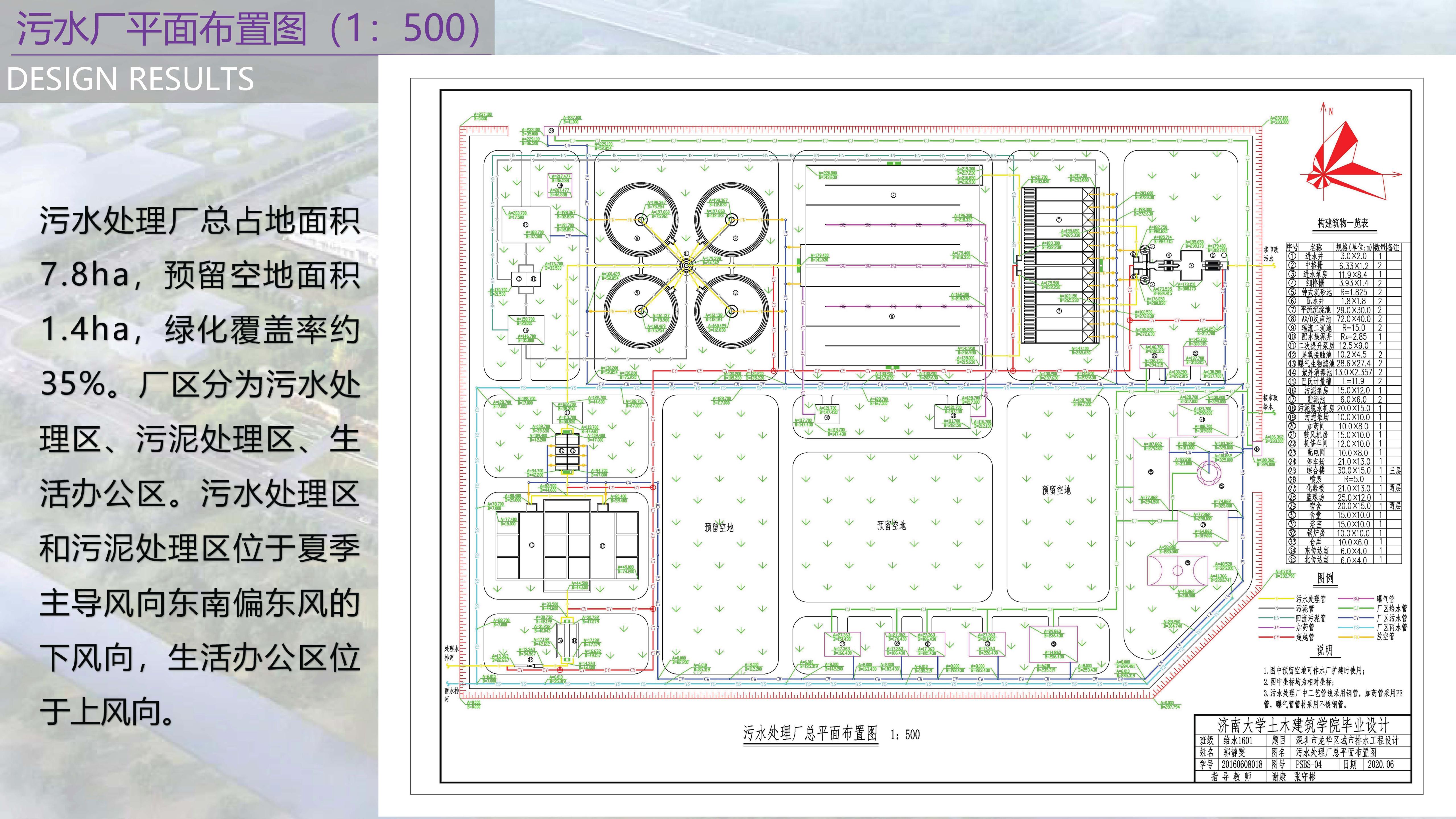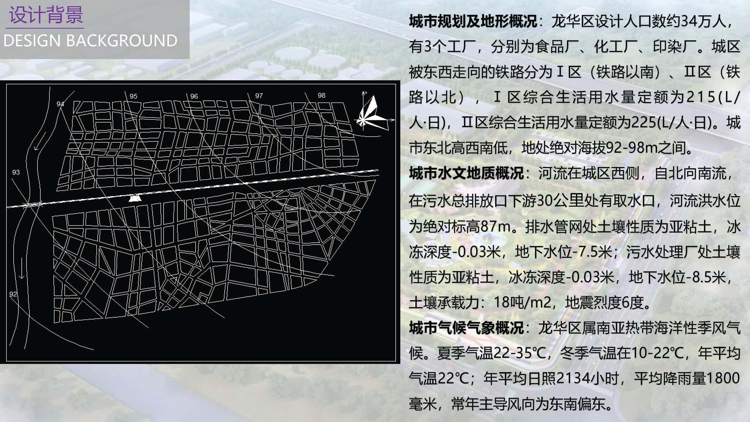设计内容:本设计为深圳市龙华区城市排水工程设计,主要进行城市排水管网设计及污水处理厂设计。设计区域位于深圳市龙华区,主要由住宅区和工厂组成,年平均气温22℃,常年主导风向为东南偏东。龙华区地面标高由东北向西南逐渐降低,河流位于城区西侧,自北向南流。铁路为东西走向并将该规划区分为Ⅰ、Ⅱ两个区。设计采用完全分流制排水系统,雨水直接排河而污水处理后排河。