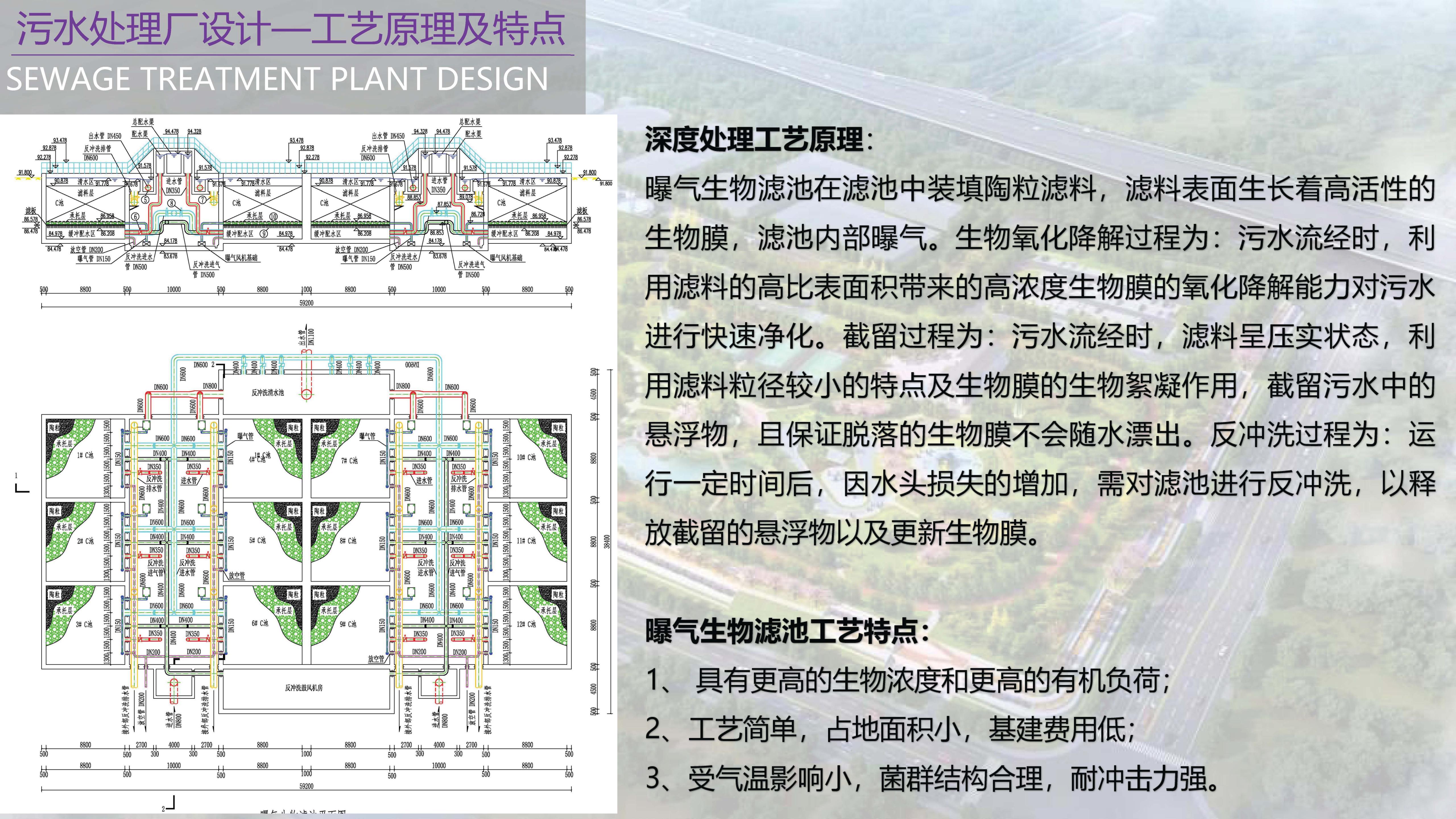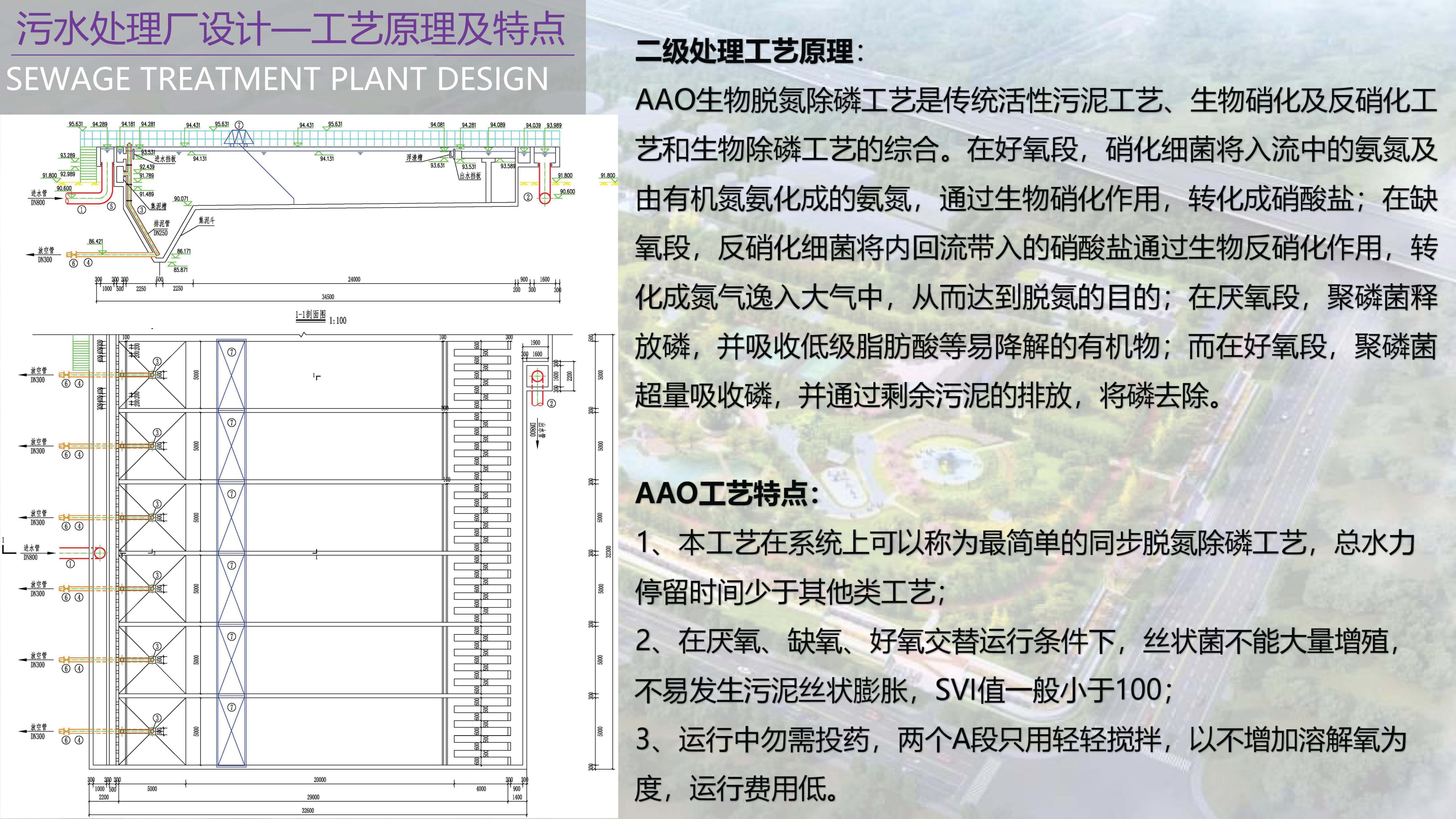 污水厂最大日设计污水量87700m3/d。设计污水进水水质为:SS=266.30mg/L,COD=412.40mg/L,BOD5=243.38mg/L,TN=37.93mg/L,NH3-N=27.48mg/L,TP=4.15mg/L。经处理达到国家污水排放标准一级A标准后排放。